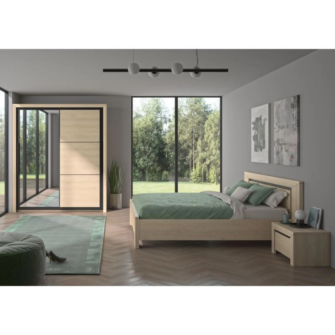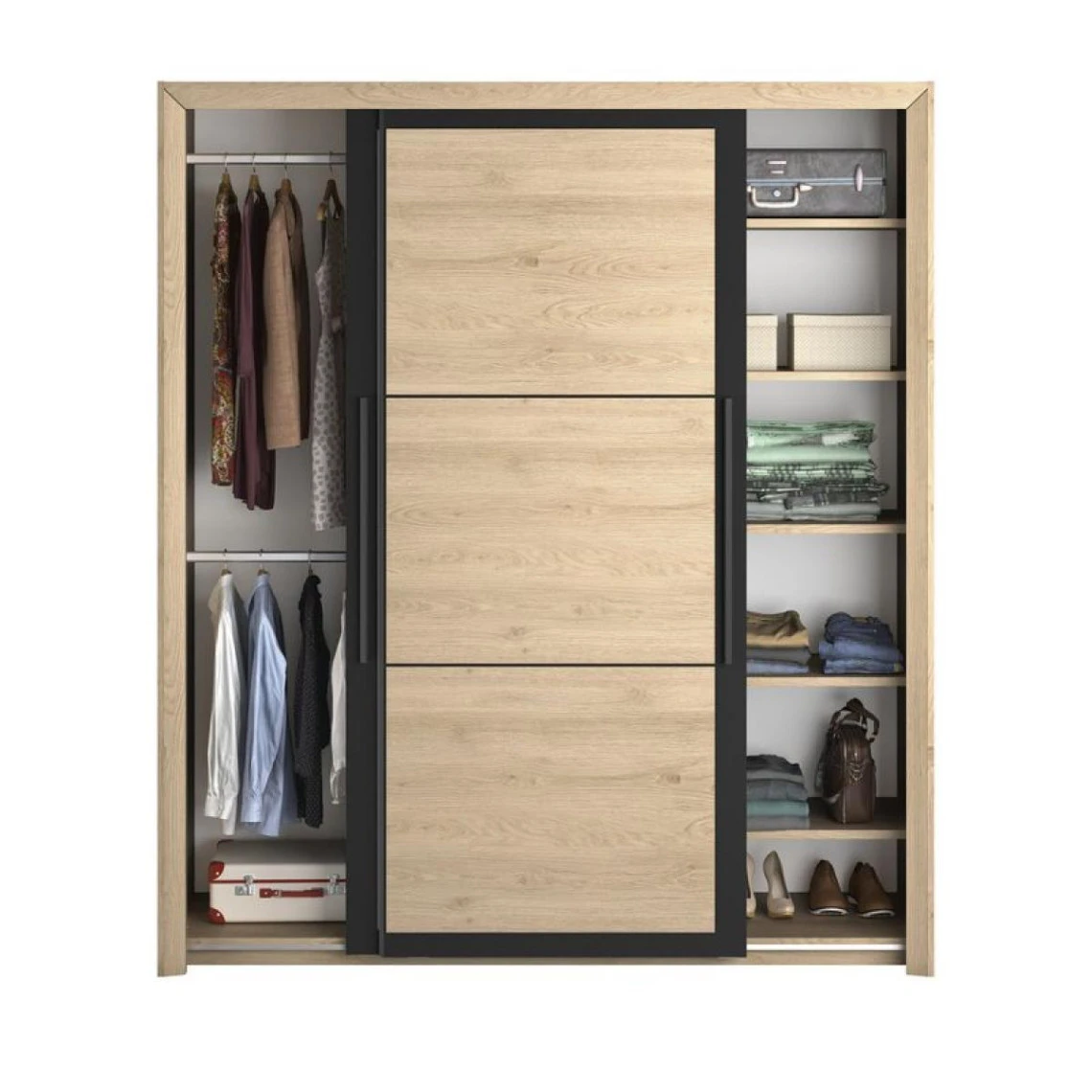 Avec sa couleur bois clair et ses cadres de porte noirs, cette armoire 2 portes coulissantes présente un style industriel. Une des façades possède un miroir pratique pour admirer votre tenue. Cette armoire à portes coulissantes imitation châtaignier naturel s’accorde aux autres éléments de la collection BRUGGES.