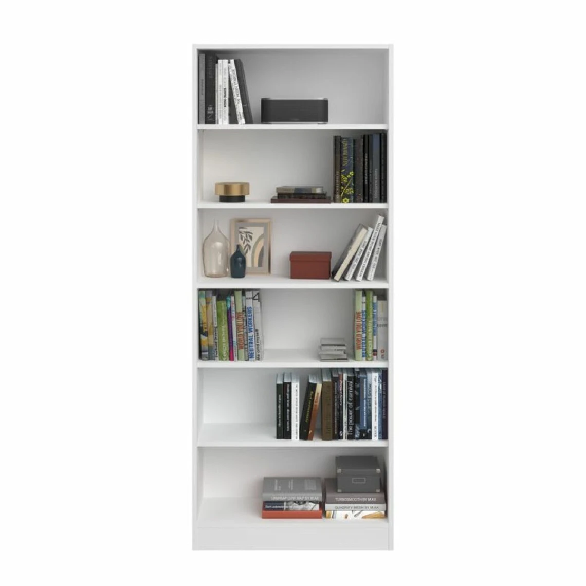 Structure :panneaux de particules et panneaux de fibres de moyenne densité. . Tablettes :5. dont 4 amovibles. . Dimensions en cm :L. 78,8 – H. 198,5 – P. 27,9 cm. . Dispo pcs detachees donnee fournisseur :NC . A monter soi-meme. . Finition :papier décor blanc. .