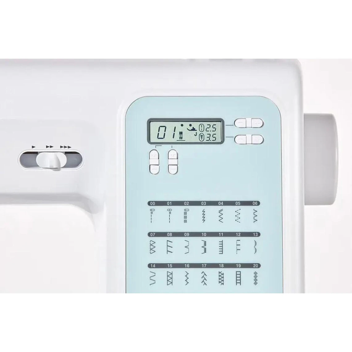 Autres informations : Ecran LCD, sélection par touches, touche fonction position de l’aiguille haut/bas, touche marche/arrêt, large espace de travail à droite de l’aiguille, choix de 5 boutonnières , robuste : crochet & châssis en métal, barre aiguille stabilisée