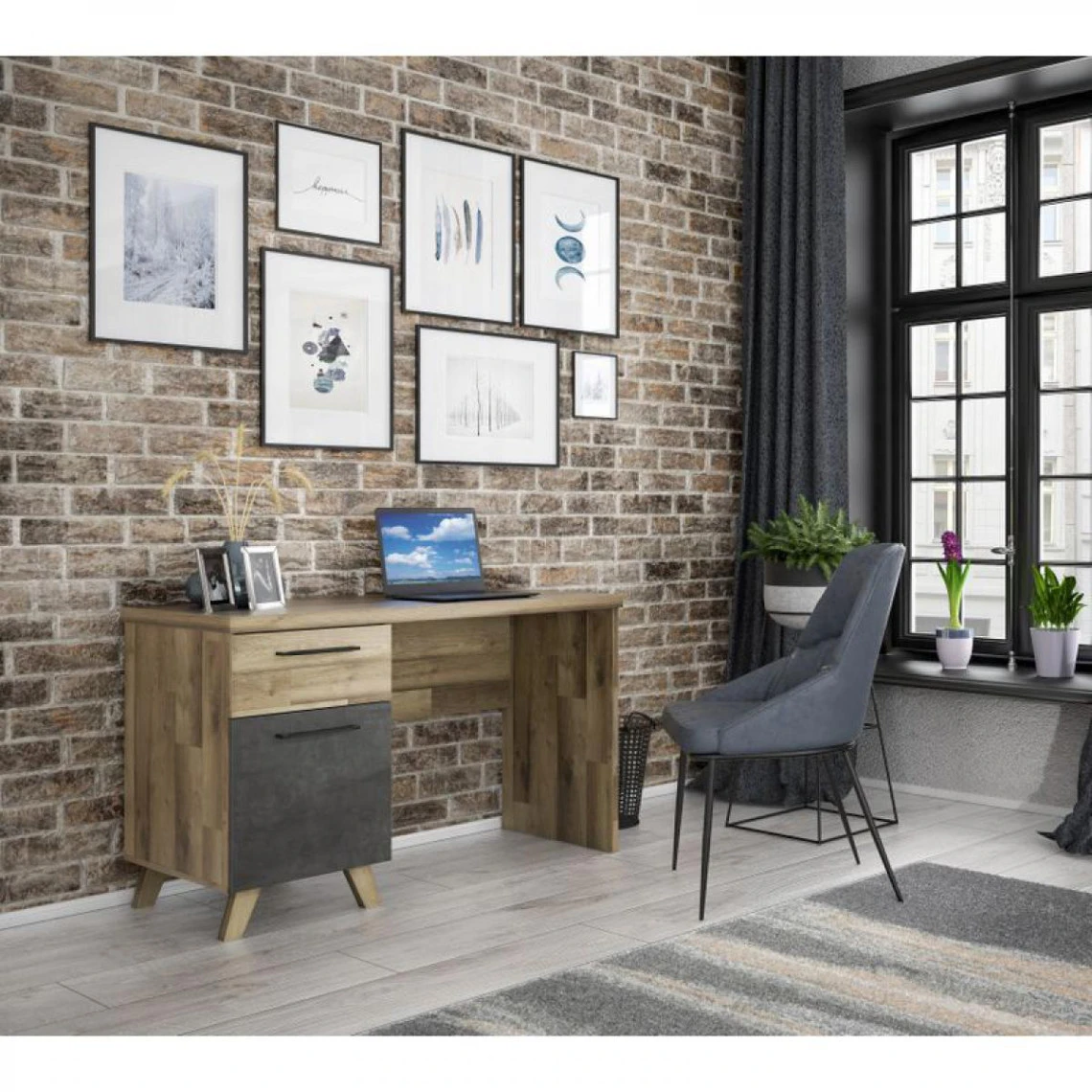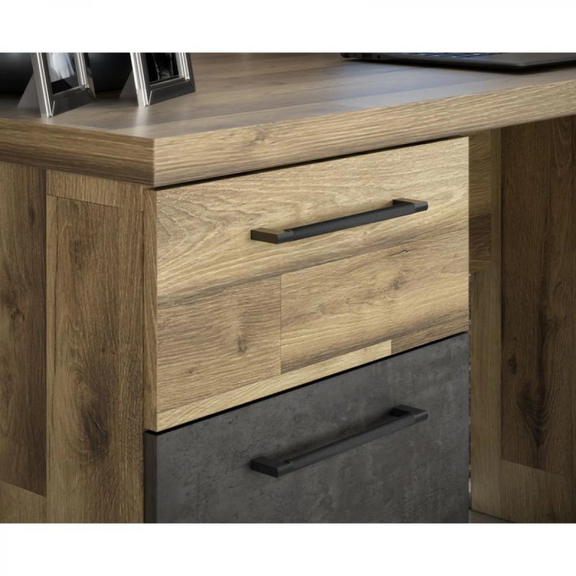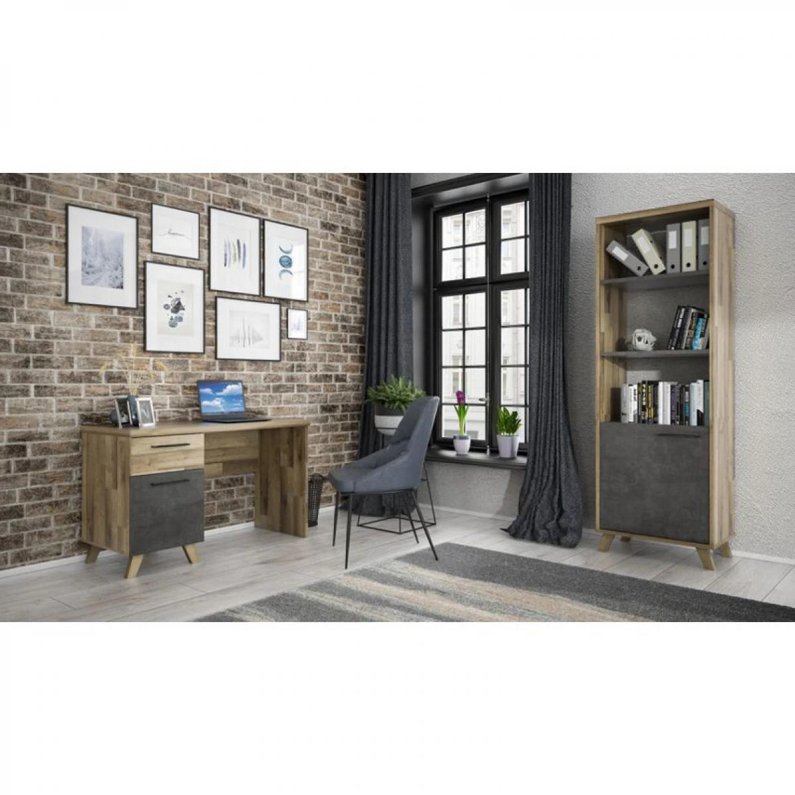 Parfait dans une pièce dédiée ou dans une chambre, ce bureau imitation chêne et béton est inspiré du style industriel. Son revêtement évoque les meubles de récupération faits de palettes, tandis que sa porte grise ajoute une touche originale. Il s’associe facilement avec des étagères noires ou en bois clair.
