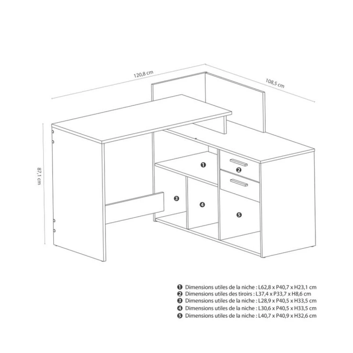 Structure :panneaux de particules. . Finition :papier décor imitation chêne et noir. . Charge maxi autorisee :30 kg. . Dimensions en cm :L. 120,8 – H. 87,1 – P. 108,5 cm. Plan de travail : L. 103 – P. 50 cm. Tiroirs : 2 x L. 37,4 – H. 8,6 – P. 33,7 cm. . Dispo pcs detachees donnee fournisseur :2 ans . Garantie :2 ans. . A monter soi-meme. .