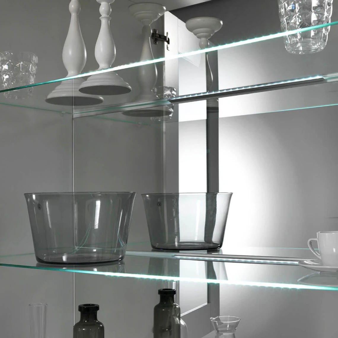 Structure en panneaux de particules, finition laqué blanc. Façades finition laqué noir brillant. Portes vitrées. Poignées en plastique, couleur chrome. Leds incluses.