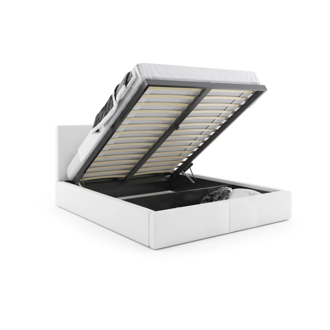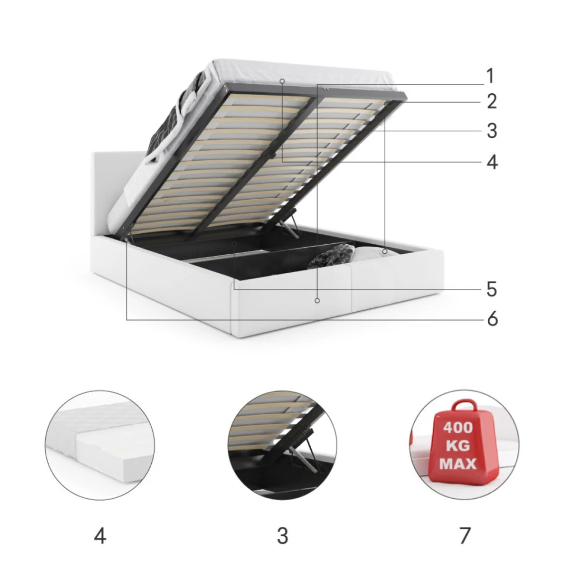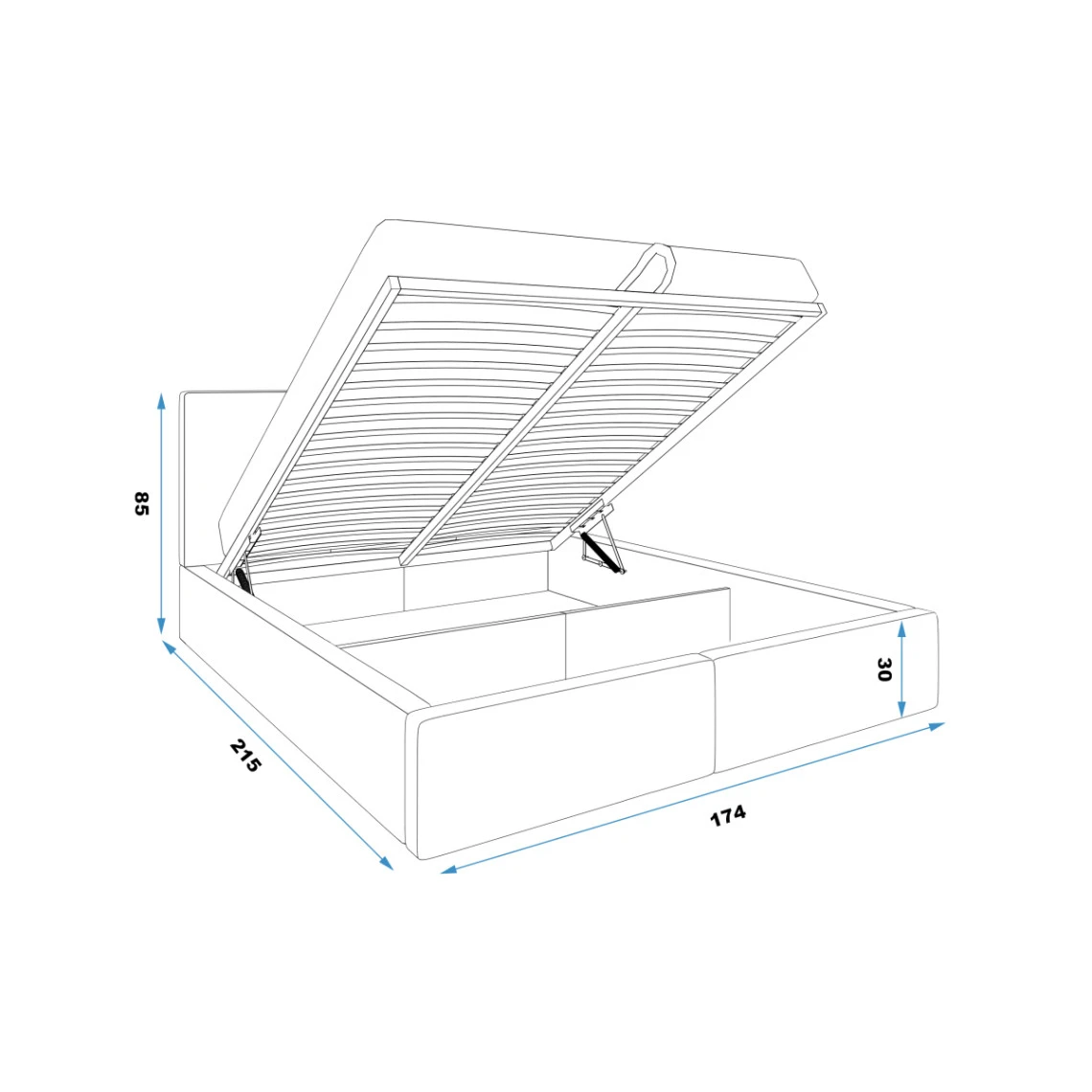 La structure du lit est en panneau stratifié de haute qualité, caractérisé par sa durabilité et sa facilité de nettoyage. La tête de lit et cadre sont rembourrés ce que rend ce lit particulièrement confortable. Matériau de rembourrage se caractérise par une structure délicate et une surface recouverte d’un fin duvet, résistant à l’abrasion, au pelage et à la lumière. Le matériau a les propriétés d’une absorption limitée des fluides, ce qui a un effet positif sur sa propreté. Cadre de lit matelassé. Longueur : 209cm. Largeur : 174cm. Hauteur : 85cm (la tête de lit) / 30cm (lit). Le sommier : monté sur les mécaniques à ressorts métalliques, composé de 30 solides lattes en bouleau absorbant les chocs, montées sur une structure en bois. après avoir soulevé le cadre, l’espace est divisé par une cloison. Il n’y a pas de fond bas dans la partie arrière. À l’avant, il y a un coffre pour la literie. Grace à ce rangement ce lit est le rois du gain de place. Mécanismes à ressort. Accessoires de montage – installation rapide et facile. Livré sans matelas. La charge maximale sur le lit est de 400 kg. Disponible en 5 couleurs : blanc cassé, gris clair, gris anthracite, bleu ou vert. 4 dimensions de largeur au choix : 120, 140, 160 ou 180 cm.