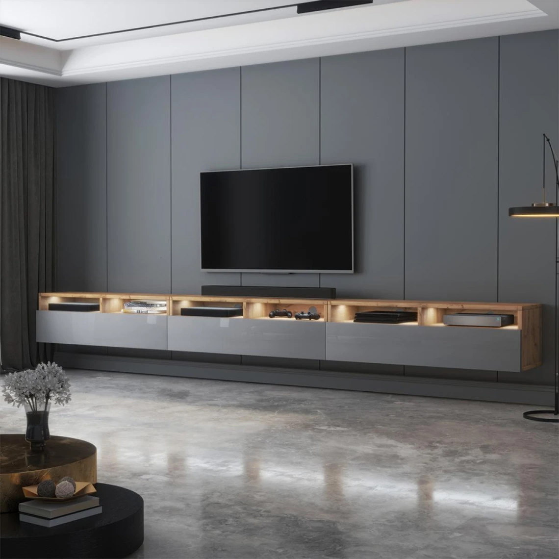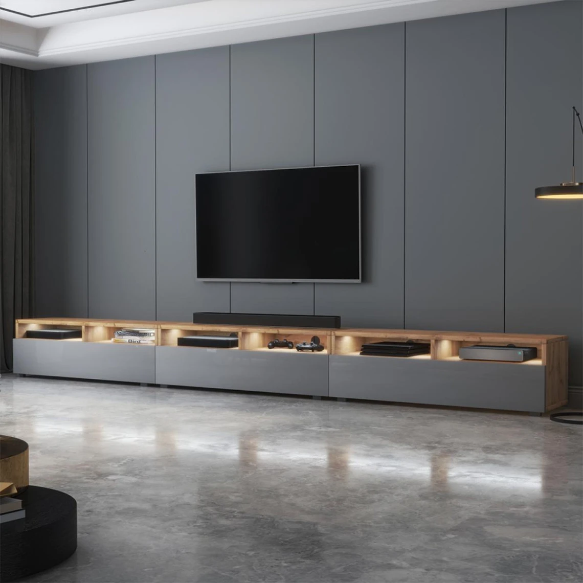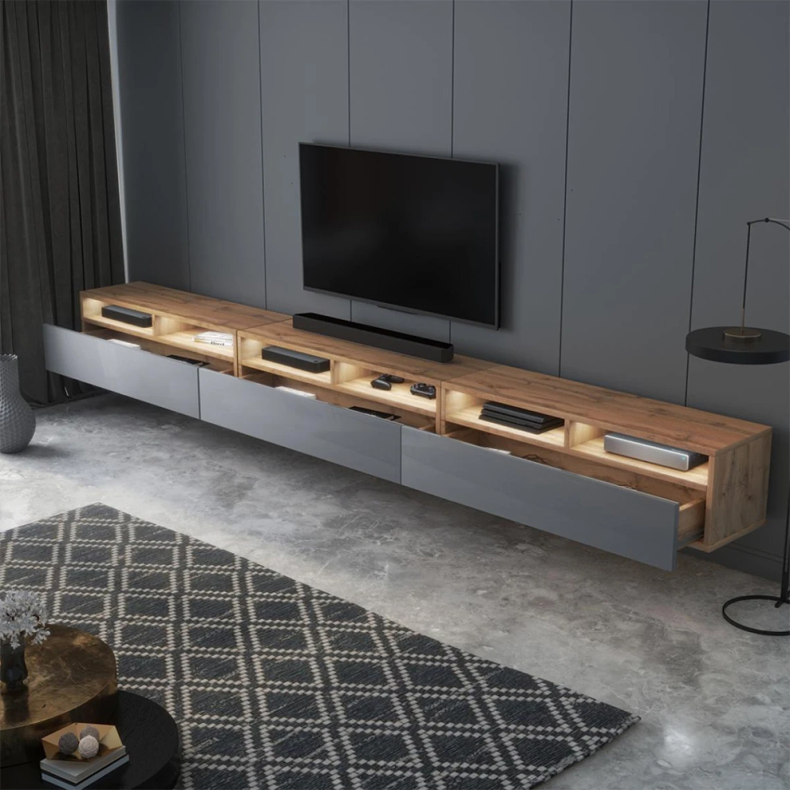 Points forts Selsey Meuble TV – REDNAW – 300 cm – chêne wotan / gris brillant – avec LED
