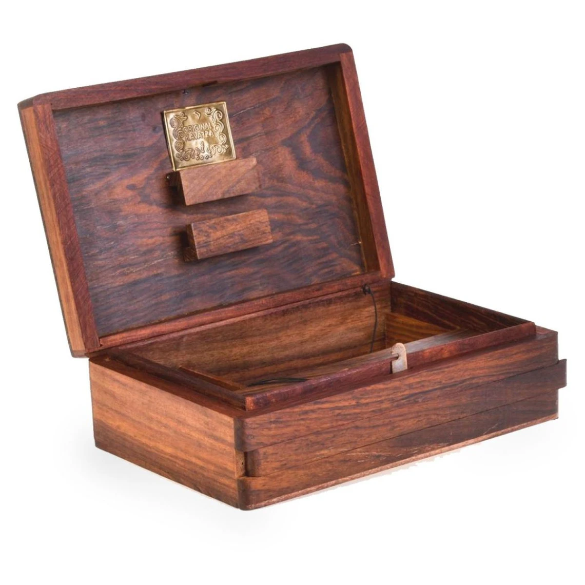 Très belle boite de rangement en bois sculpté de jolies petites fleurs lui procurant un aspect artisanal authentique. La boite Original KAVATZA a été conçue en pensant au moindre détail qui fera qu’elle vous facilitera le rangement de vos accessoires fumeurs : Vous retrouverez à l’intérieur un emplacement pour vos feuilles ainsi que des petits compartiments pour vos filtres, votre tabac, votre briquet pour ne citer que ces exemples. Vous retrouverez également un ingénieux support en bois incurvé avec son bâtonnet tasseur vous permettant de rouler facilement et proprement. 2 petits supports sont placés sur l’arrière de la boite afin d’éviter aux charnières de casser lorsque la boite est ouverte. Sans oublier son système de fermeture invisible à l’œil…