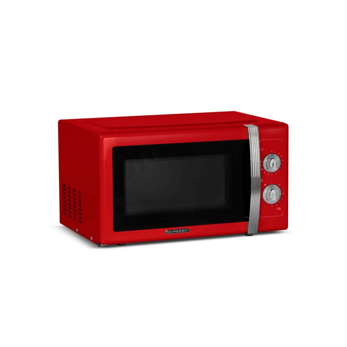 Points forts Schneider SMW23VMR – Micro ondes gril Vintage – 23 litres – 6 niveaux de puissance – Plateau tournant (27cm) – Rouge