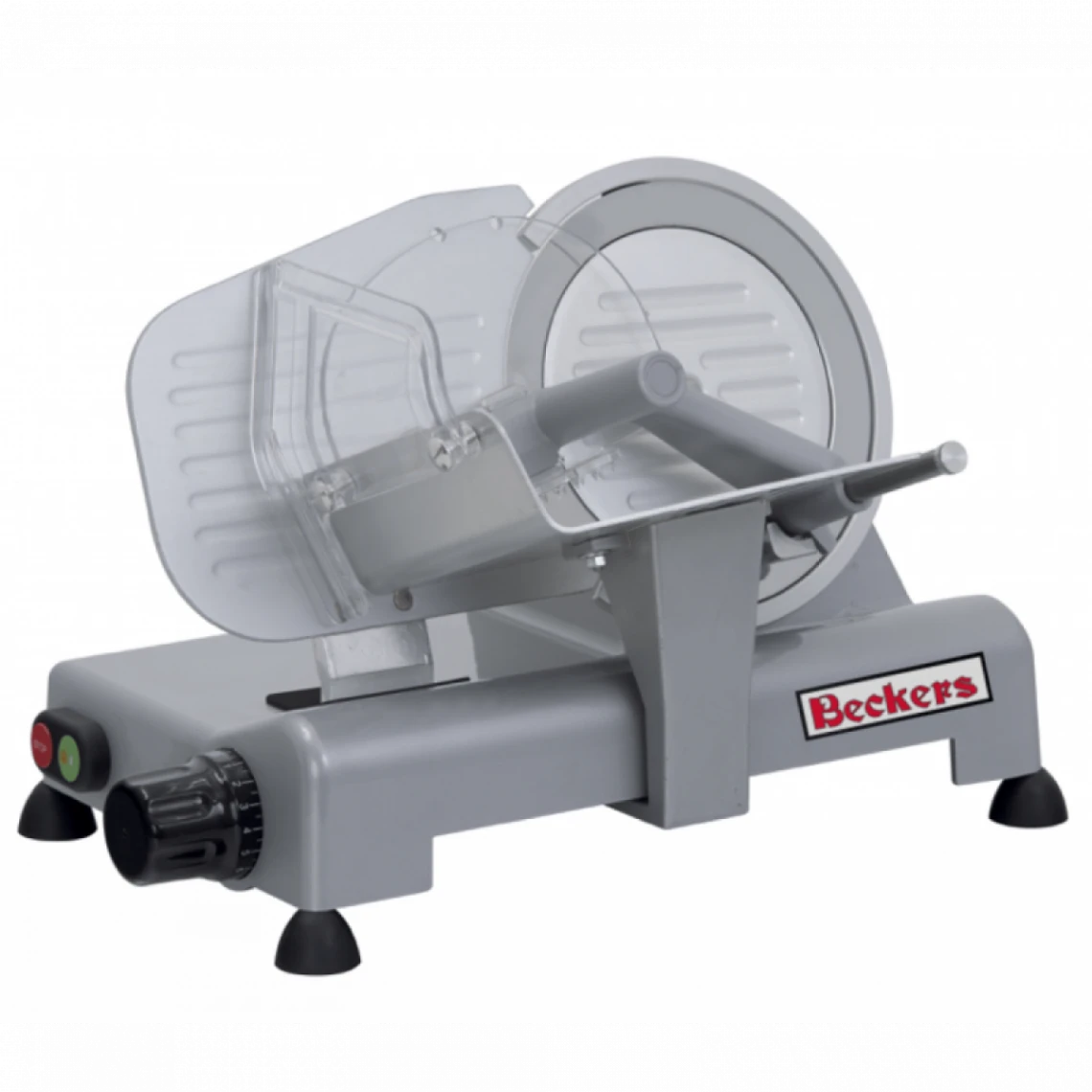 Trancheuse Série E -Beckers | Puissance: 120 WPoids: 11 kgLame ∅ 195 mmCoupe utile: 165×130 mmCourse de chariot: 210 mmLargeur: 300mmProfondeur: 430mmHauteur: 292mmDimensions de l’emballage: 470x330x370 mmCadre en aluminium moulé sous pression peintÉpaisseur de coupe: 0∾15 mmAiguiseur amovibleModules 275 et 300 avec poussoir en aluminiumProtection de verre de Plexi